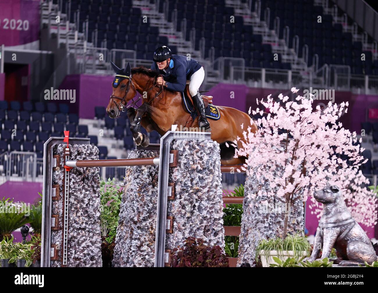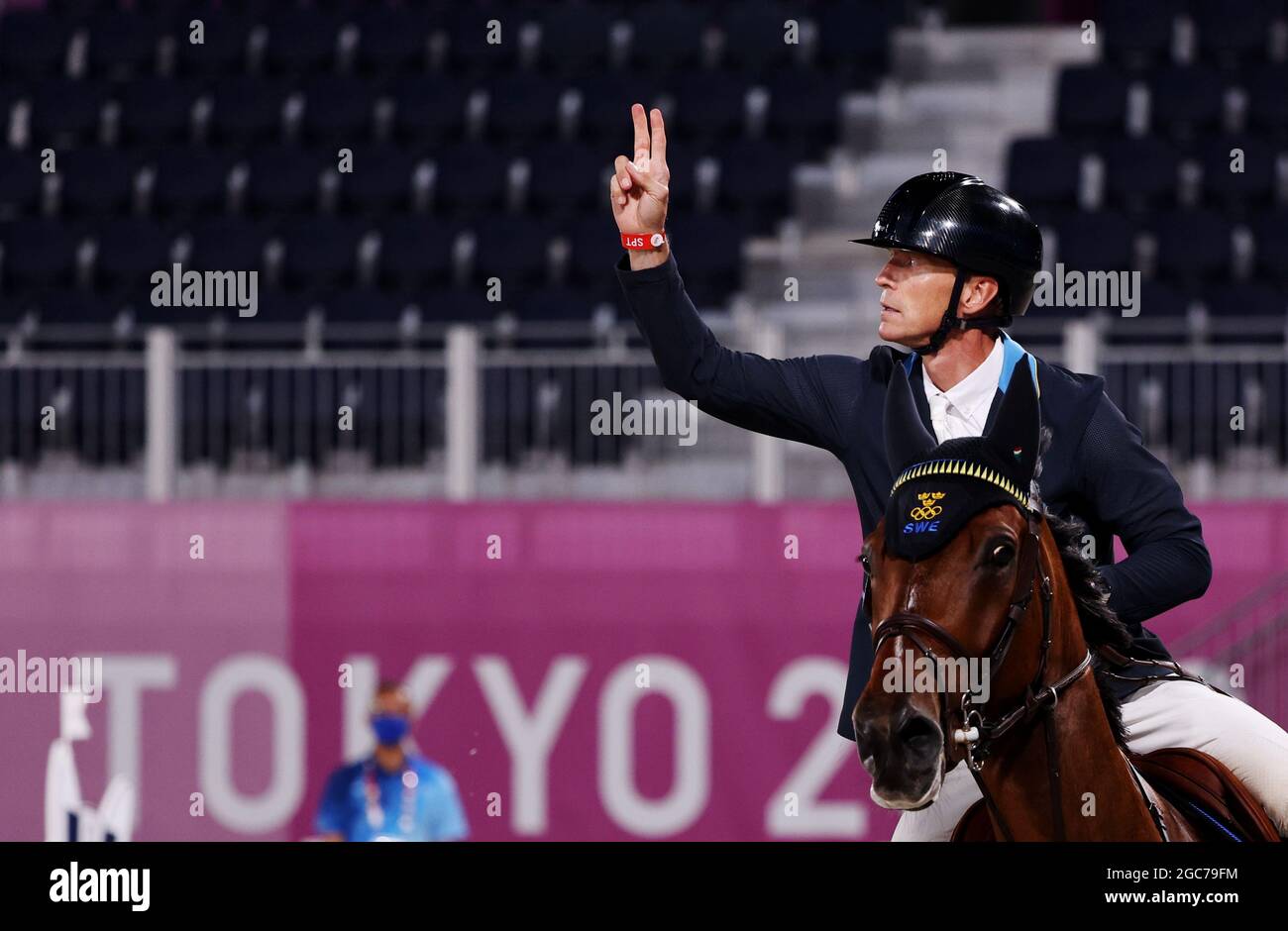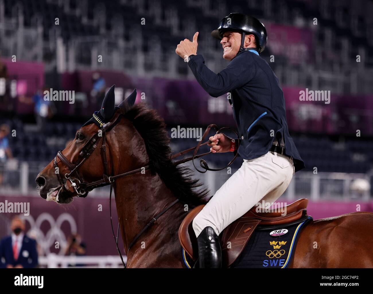 Olympische Spiele 2020 In Tokio Reiten Springen Team Finale Reitpark Tokio Japan 7 August 2021 Peder Fredricson Von Schweden Auf Seinem Pferd All In Tritt An Reuters Alkis Konstantinidis Stockfotografie Alamy